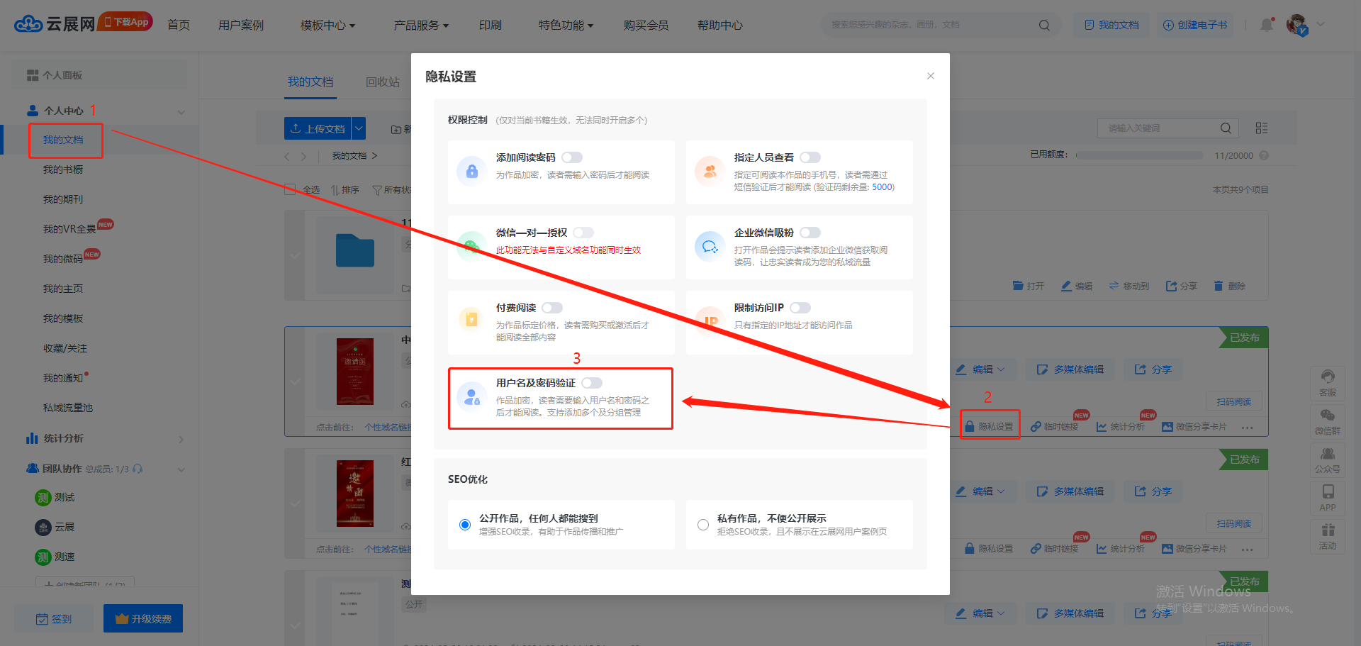 點擊【我的文檔】,選擇要設置的書本,點擊【隱私設置】,打開【用戶名及密碼驗證】。