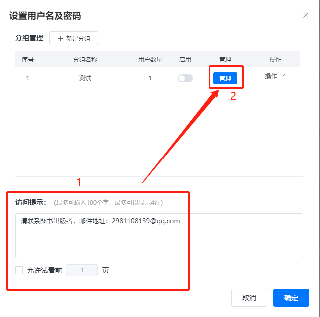 先在下方設置【訪問提示】以及允許查看前幾頁,然后點擊【管理】。