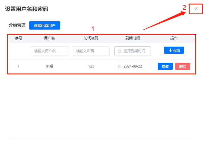 輸入【用戶名】、【密碼】,設置到期時間,點擊【添加】后,可以在下方看到創建好的用戶名和密碼,然后點擊右上角的【x】關閉界面。