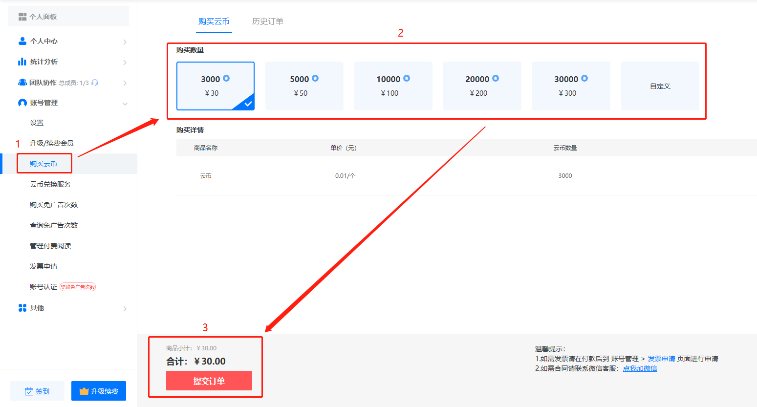 點擊【購買云幣】,選擇購買數量,下方提交訂單付款即可。