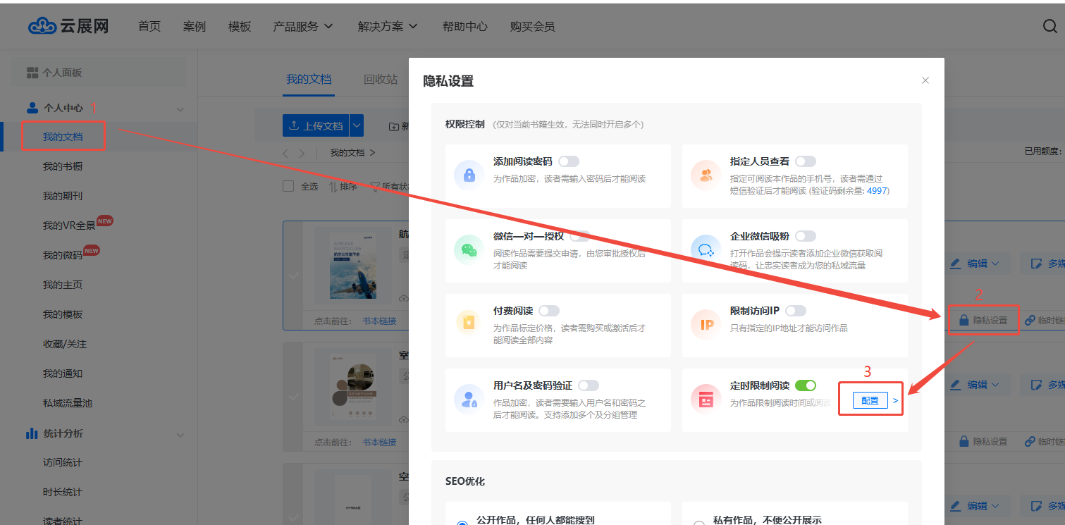 點擊【我的文檔】,再點擊【隱私設置】,開啟【定時限制閱讀】后,點擊【配置】。