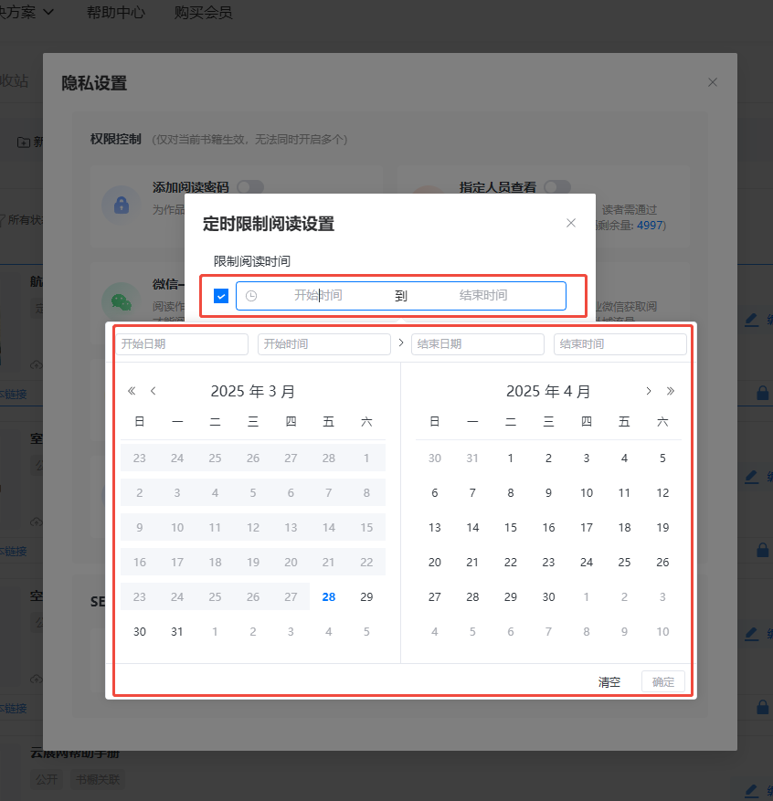 設置開啟日期時間和結(jié)束日期時間,在設置的這段時間內(nèi),書本可以正常閱讀。
