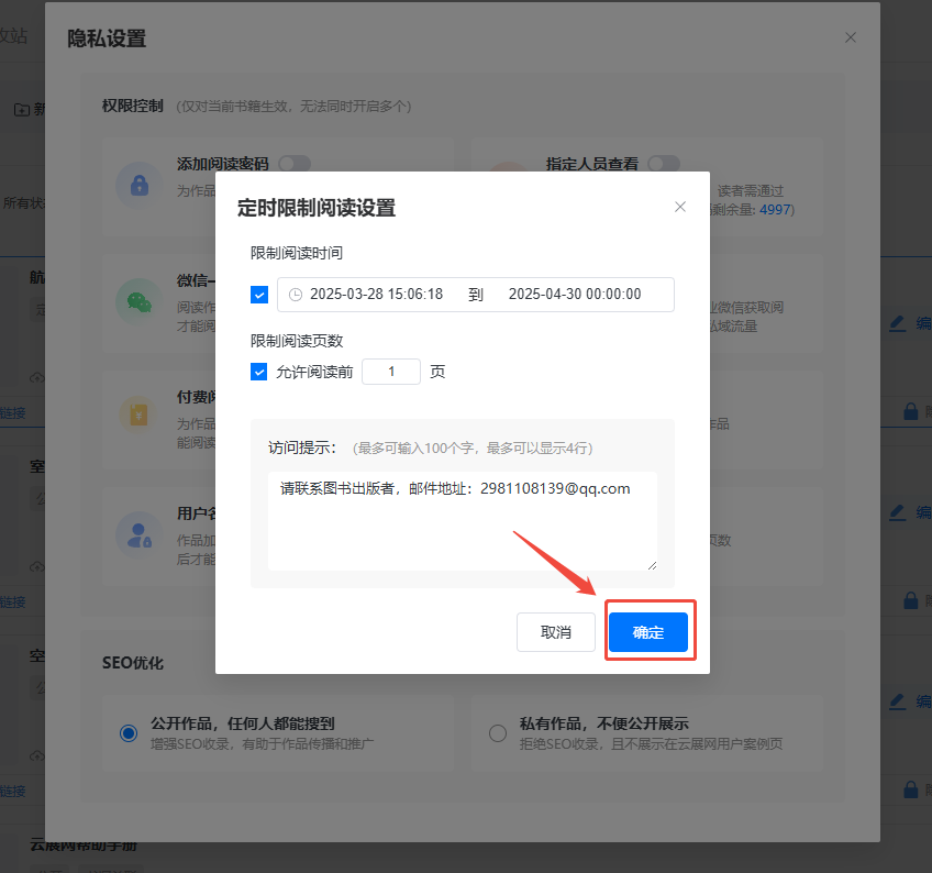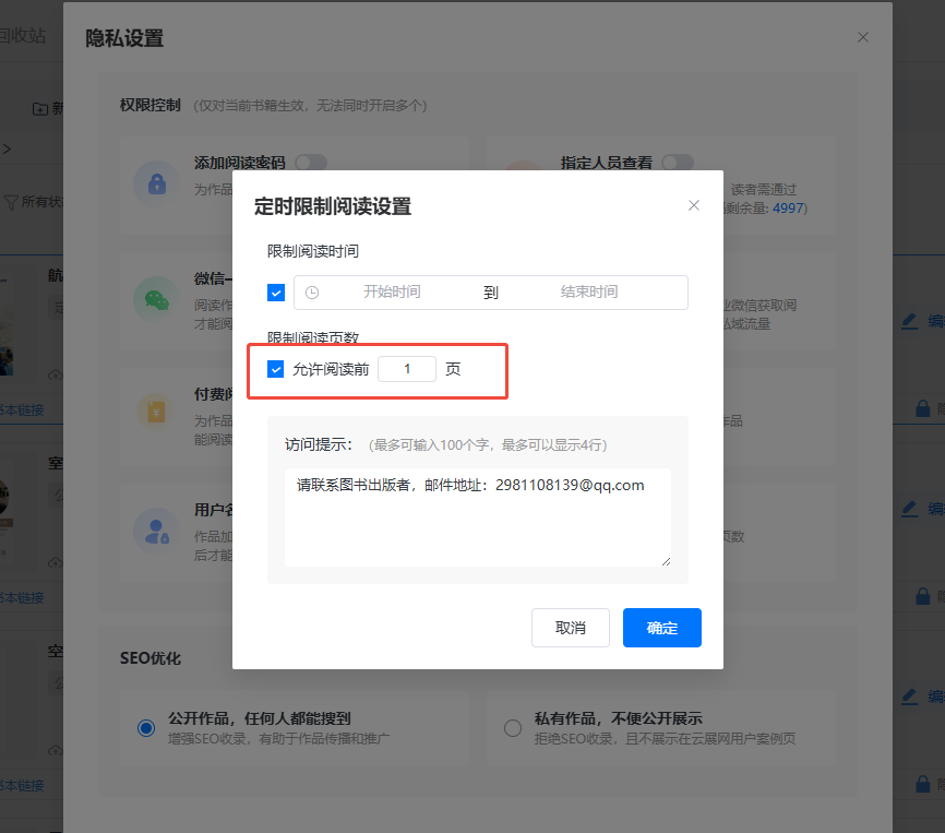 如果想要非限定的時間段內(nèi)讀者可以試看,可以設置允許閱讀前幾頁。