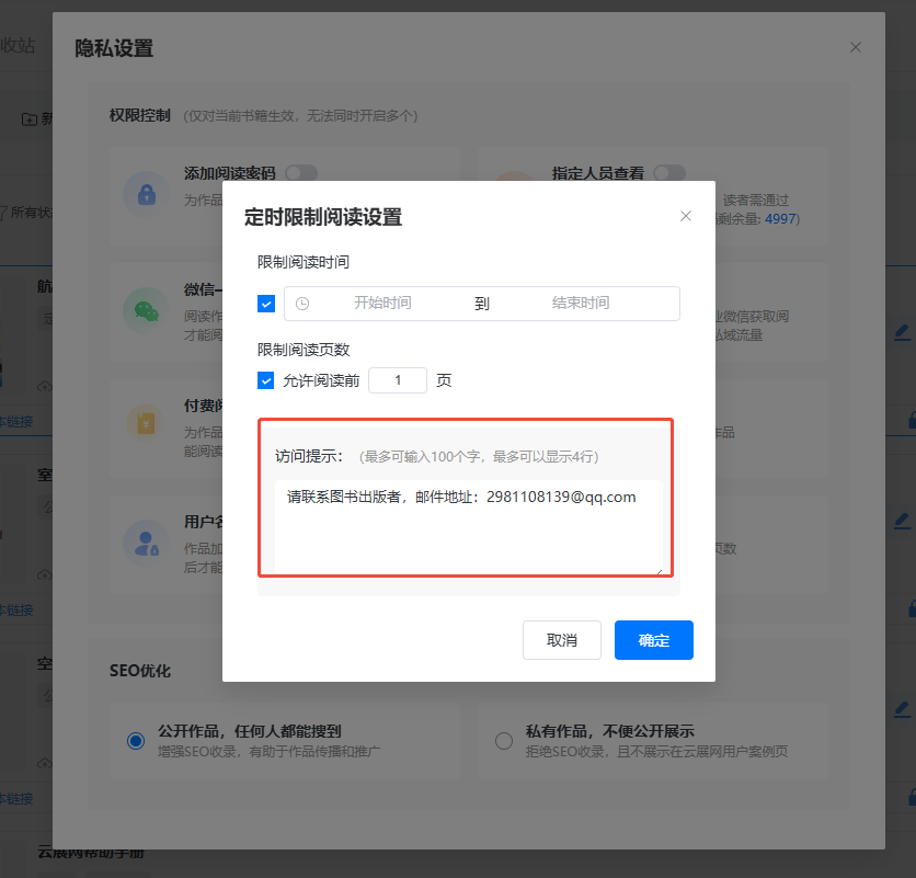 可根據(jù)你的需要,設置提示信息。比如你想讀者在無法閱讀的時候,能夠通過提示信息及時聯(lián)系到你,那你可在信息提示里輸入自己的郵箱地址。