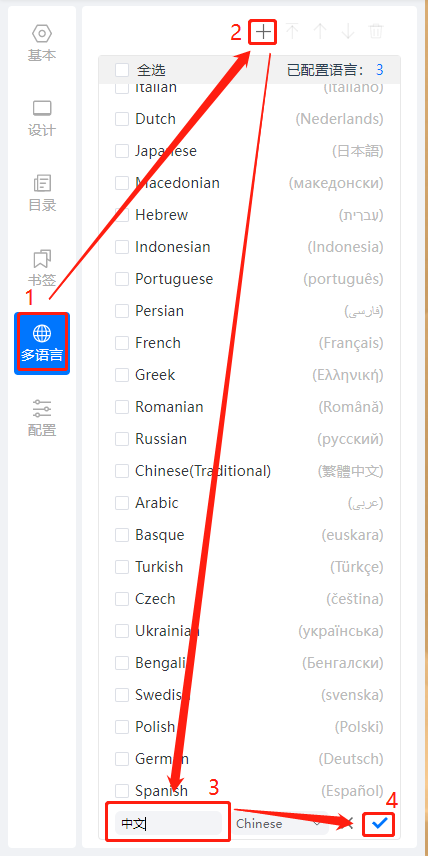 如果您希望統一修改文字提示,直接選擇一個語言修改即可;如果您不希望這個修改應用到所有書本,建議新建一個語言,下面以新建語言為例,點擊【多語言】,然后點擊【+】號,下方輸入名稱,再點擊【√】。