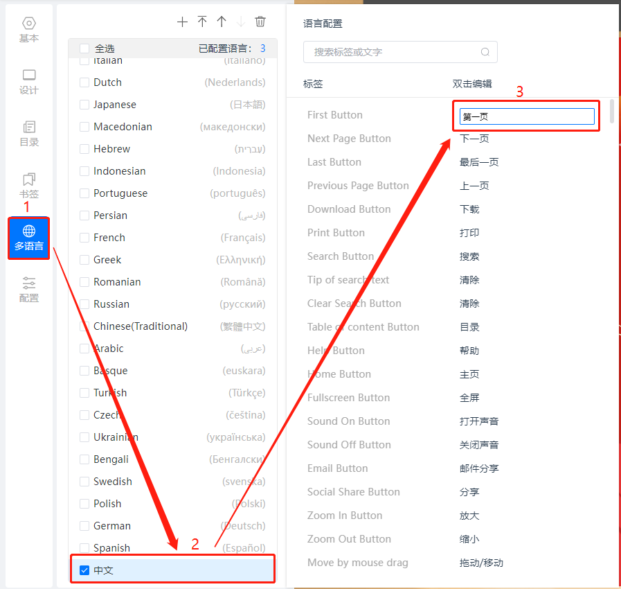 云展網的語言功能,有兩種設置方式:一種是設置多種語言讓讀者閱讀時選擇適合自己的語言;一種是修改書本按鈕的提示文字。