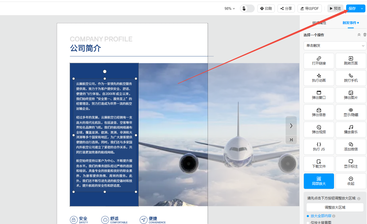 點擊【鏈接】,將鏈接框覆蓋到對應的位置,然后點擊【觸發事件】,選擇【局部放大】,點擊【調整放大區域】,選取需要放大的區域,選取之后選擇放大全部內容或者僅放大背景圖。