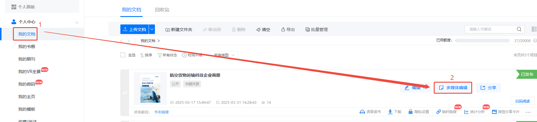 點進【我的文檔】/【文檔】,選擇對應電子書,點擊【多媒體編輯】/【內容編輯】。