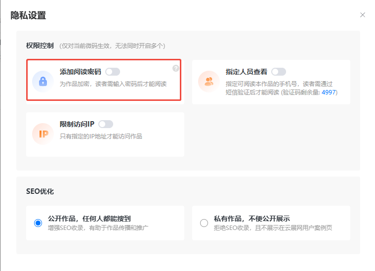 此功能可以給制作的微碼設置一個或多個密碼,這樣讀者需要輸入設置的密碼才可以閱讀該微碼,添加密碼可以有效保護微碼內容的安全性和隱私。