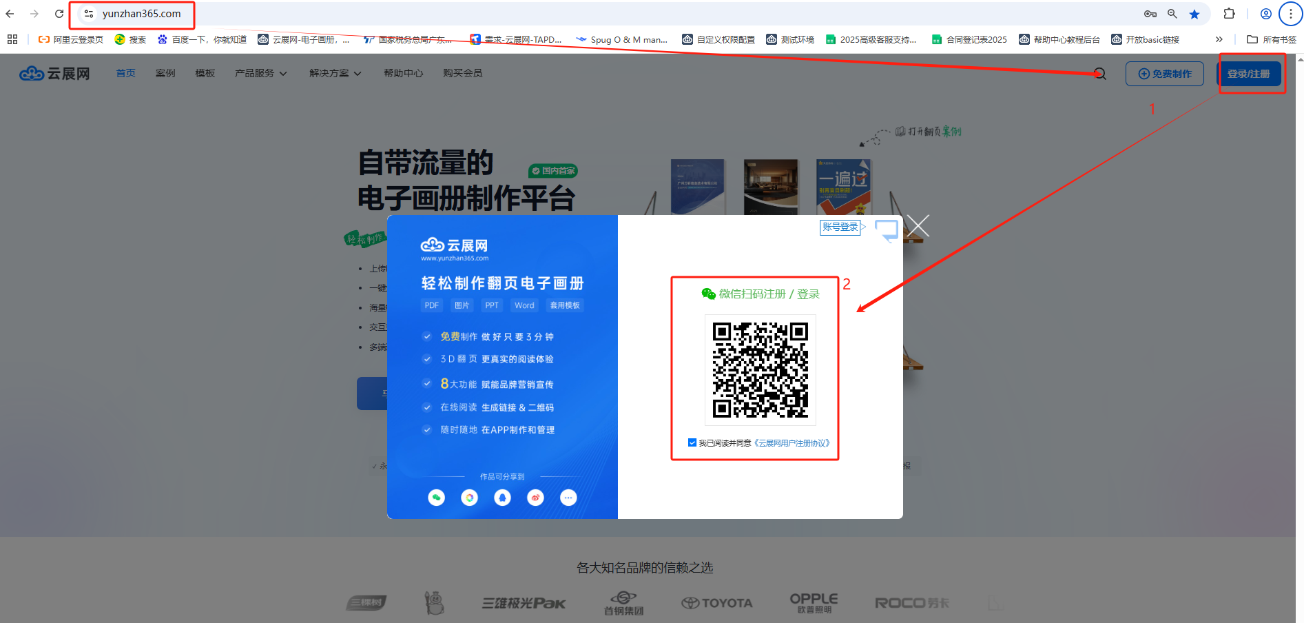 在電腦上打開瀏覽器,輸入網(wǎng)址http://www.gaolipp.com/打開云展網(wǎng),然后點擊右上角的【登錄/注冊】按鈕,用微信掃描二維碼登錄