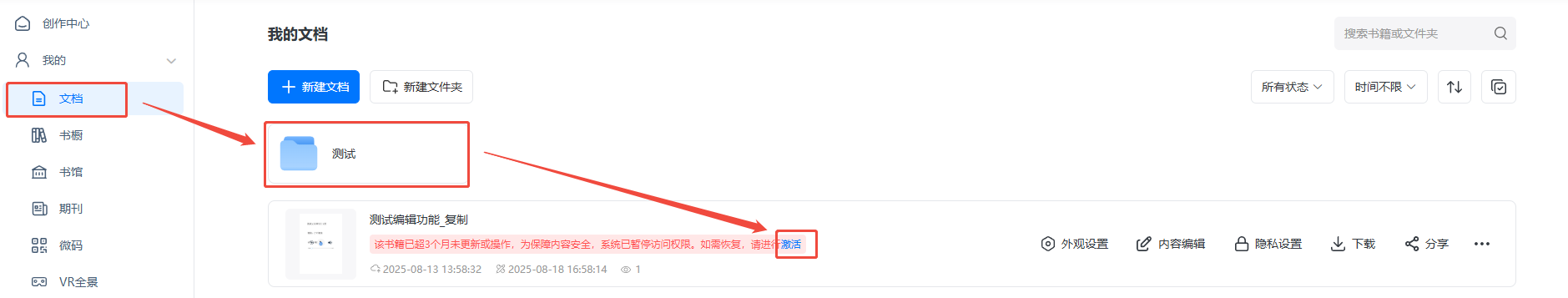 為進一步保障內容安全,免費用戶的書籍若連續三個月內無任何編輯、修改等更新操作,或者付費會員會員資格到期滿三個月起,系統將對書籍進行暫時停止訪問處理,用戶登錄賬戶并完成激活操作后,可立即恢復書籍的正常訪問權限。
