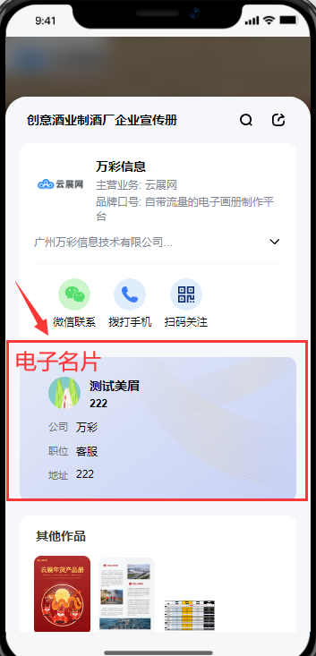 點擊【作品】,點擊對應電子書右邊三個點,然后點擊【設置名片】打開名片設置界面。