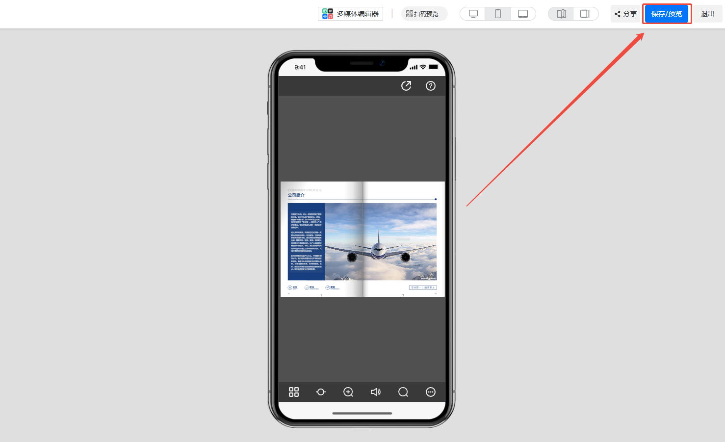 如何實現手機端豎屏雙頁顯示? 一、功能介紹 此功能可以讓電子畫冊在手機端上豎屏雙頁顯示。 二、操作步驟 1、打開編輯界面 點擊【我的文檔】,選擇需要設置的電子畫冊,點擊【編輯】。 2、設置雙頁顯示 點擊【設計】,然后點擊【設置】,把【單雙頁顯示】改為雙頁即可。 3、保存 點擊【保存/預覽】即可保存。