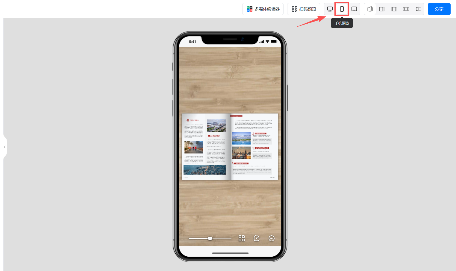 如何實現手機端豎屏雙頁顯示? 一、功能介紹 此功能可以讓電子畫冊在手機端上豎屏雙頁顯示。 二、操作步驟 1、打開編輯界面 點擊【文檔】,選擇需要設置的電子畫冊,點擊【外觀設置】。 2、設置雙頁顯示 點擊【設置】,在搜索欄輸入“單雙頁”,【單雙頁顯示】選擇“雙頁”即可。 3、預覽效果 點擊右上角的手機預覽按鈕,可查看手機端豎屏雙頁效果