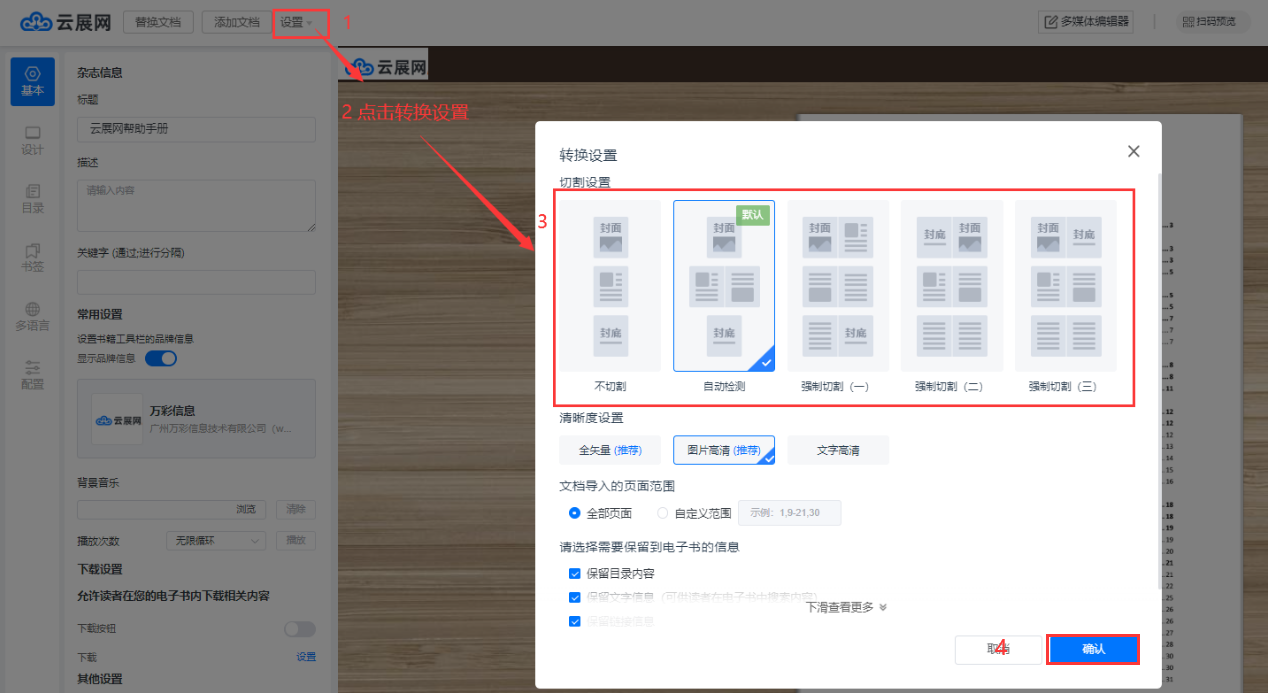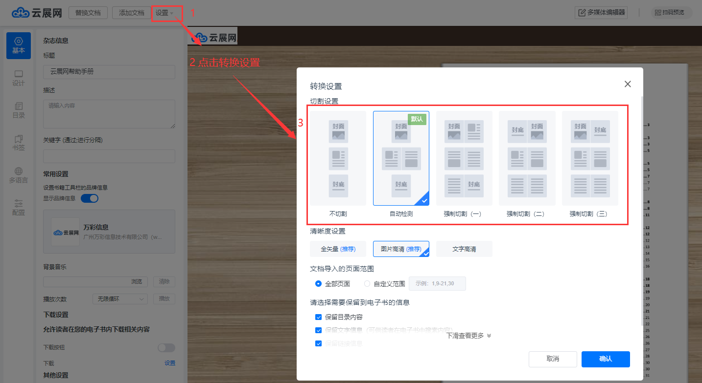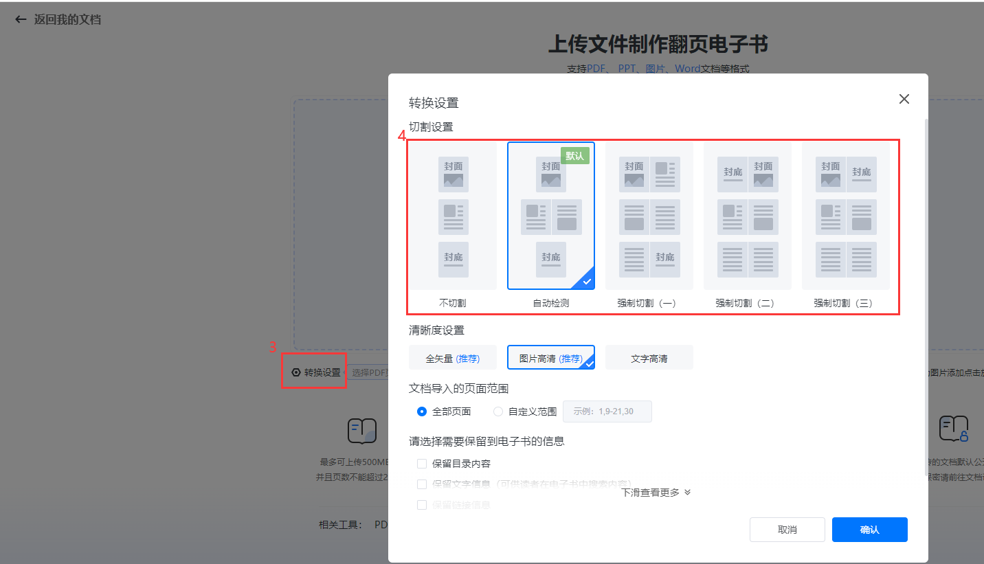 在【我的文檔】頁面,點擊【上傳文檔】打開上傳頁面,點擊【轉(zhuǎn)換設(shè)置】,選擇切割方式