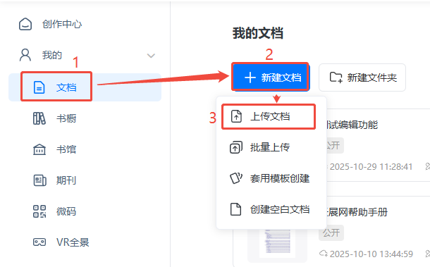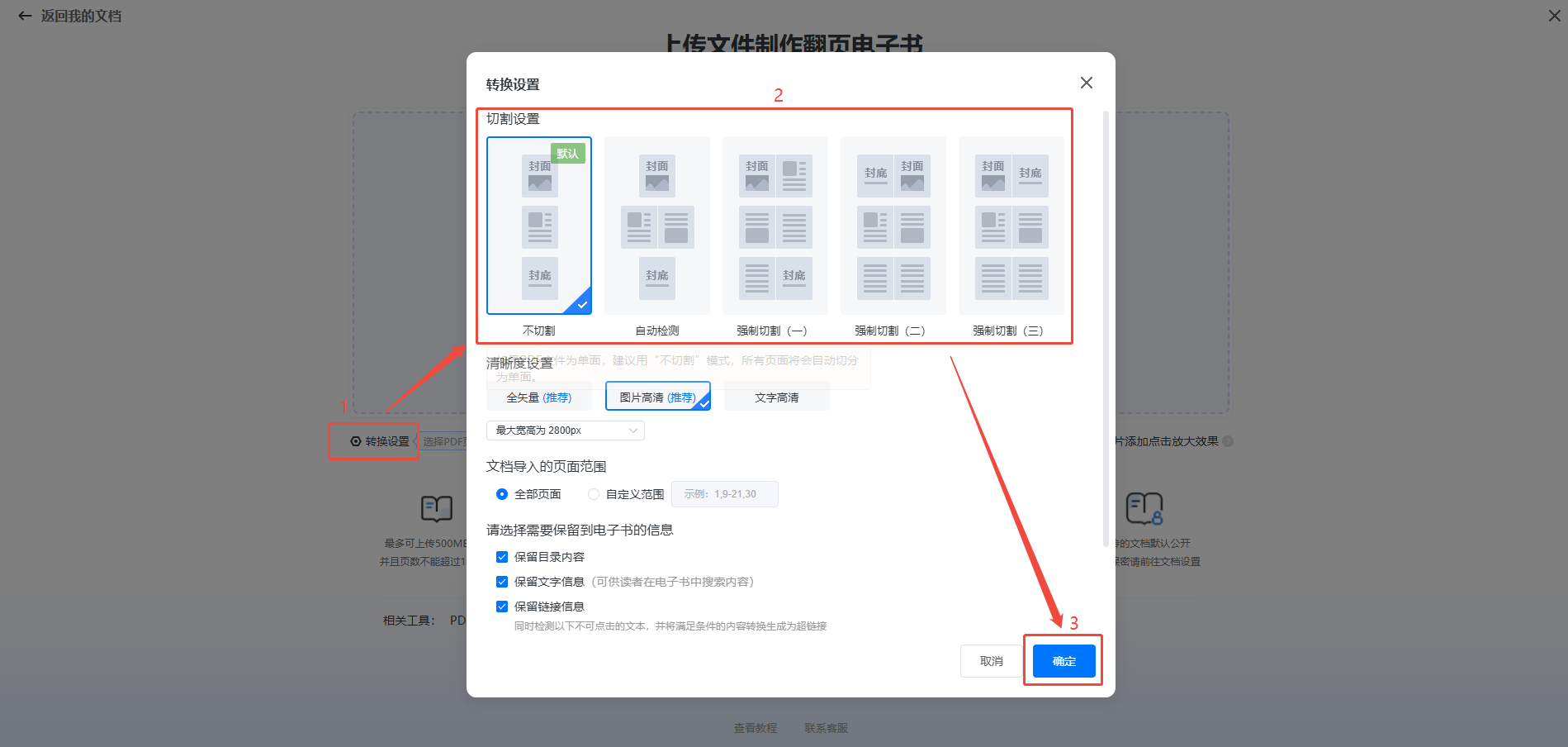在【文檔】頁面,點擊【新建文檔】里面的【上傳文檔】,點擊【轉換設置】,選擇切割方式后點擊【確定】。