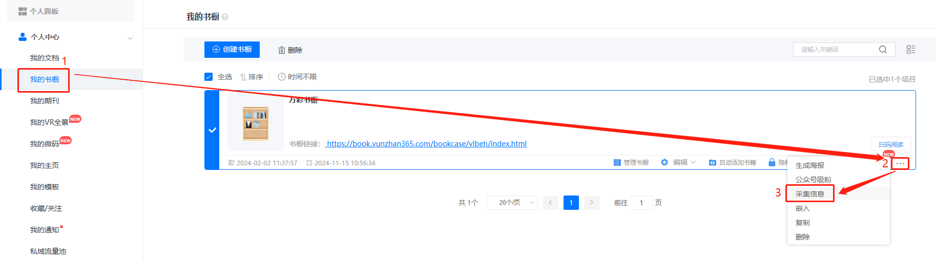 點擊【我的文檔】/【我的書櫥】,找到書本/書櫥,點擊右下角三個點,點擊【采集信息】。