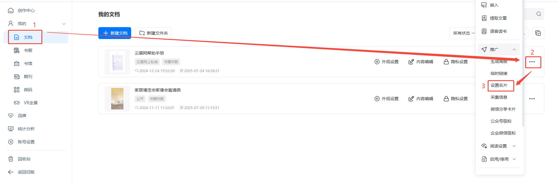 點擊【文檔】,選擇需要的電子書,點擊右邊三個點,選擇【推廣】,點擊【設(shè)置名片】,打開名片設(shè)置界面。