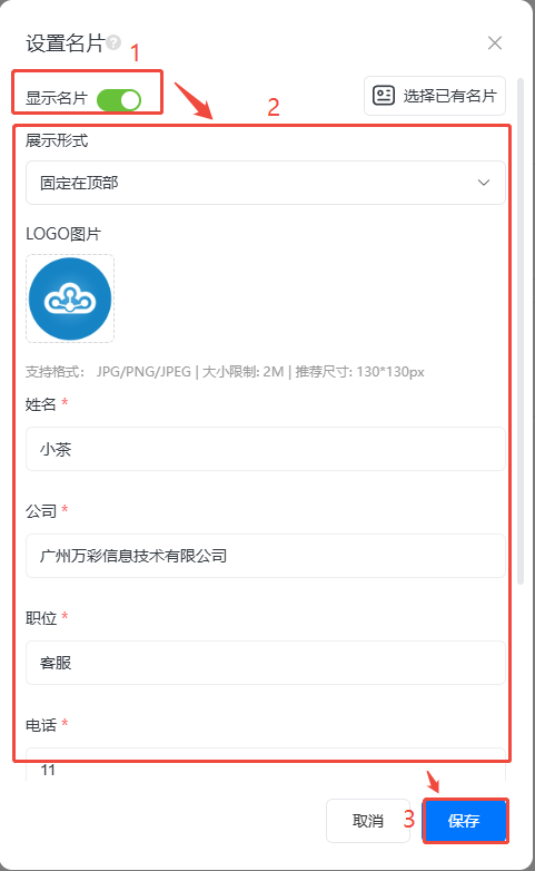 打開【顯示名片】,選擇一個【展示形式】,下方上傳logo輸入對應(yīng)信息后,點擊保存即可。