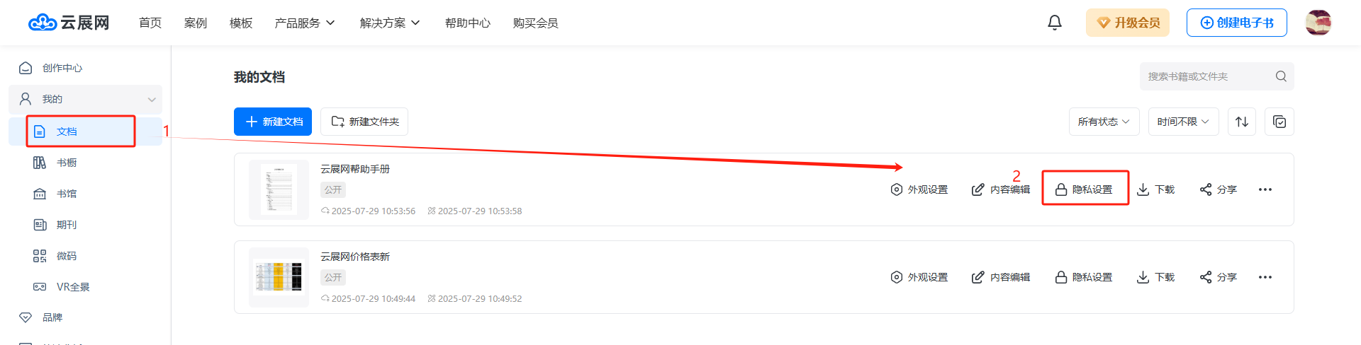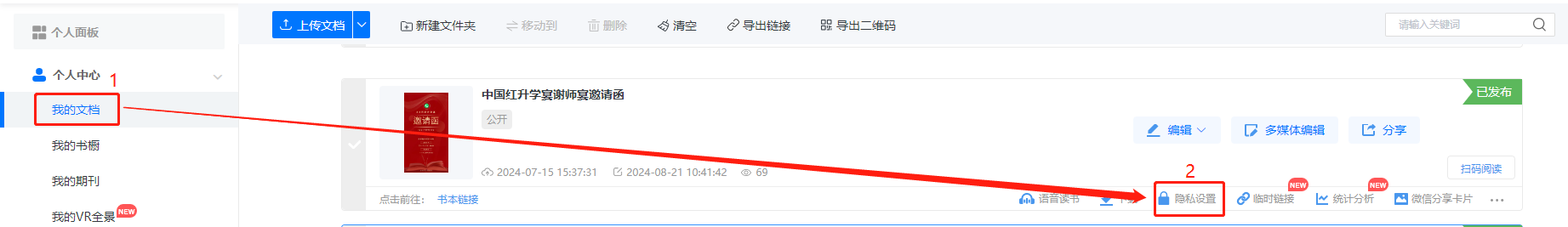 在【我的文檔】里找到要設置的電子雜志,點擊【隱私設置】。