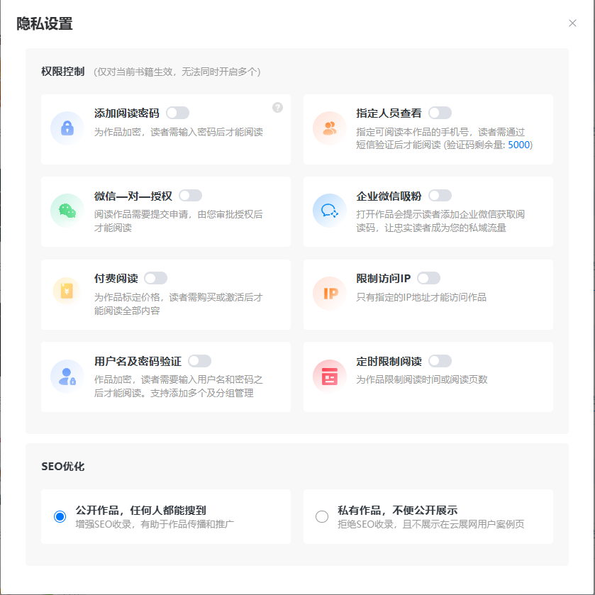 電子雜志隱私設置有10種:添加閱讀密碼、指定人員查看、企業微信吸粉、微信一對一授權閱讀、付費閱讀、限制訪問IP、用戶名及密碼驗證、定時限制閱讀、在云展網上私有、網站上公開。