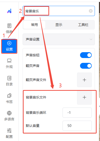 聲音按鈕:顯示/隱藏音樂按鈕。禁用時不播放背景音樂,也沒有翻書聲音。