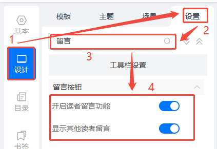 點擊【設計】,然后點擊【設置】,搜索欄搜索【留言】,將【開啟讀者留言功能】和【顯示其他讀者留言】打開。