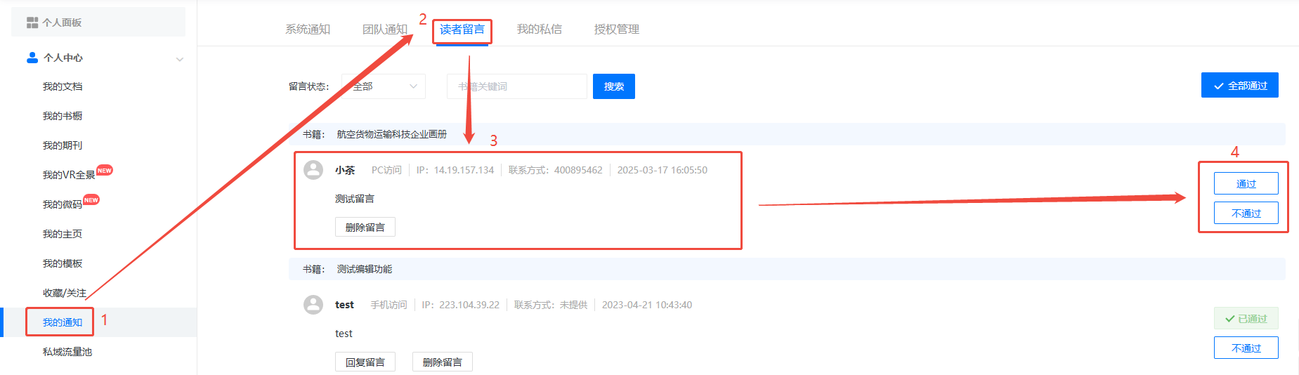 點擊【我的通知】,然后點擊【讀者留言】就可以看到讀者留下的留言,姓名,聯系方式,在右側選擇通過或者不通過。