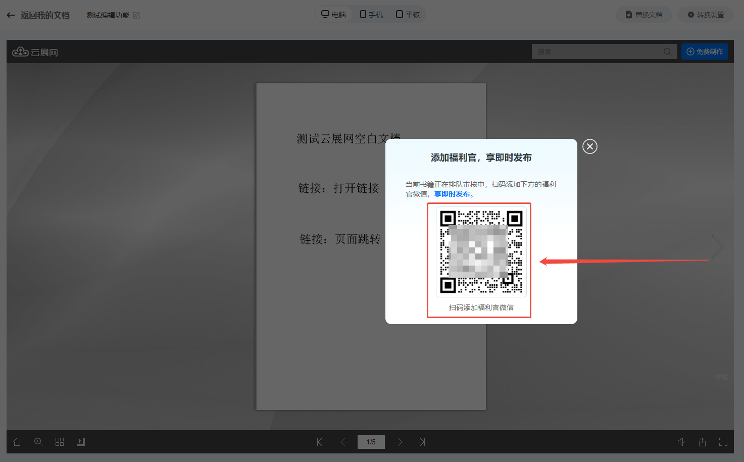 (2)點擊【文檔】找到正在審核中的電子書,鼠標移動到藍色字體【添加微信】會顯示出微信二維碼,掃碼添加即可。