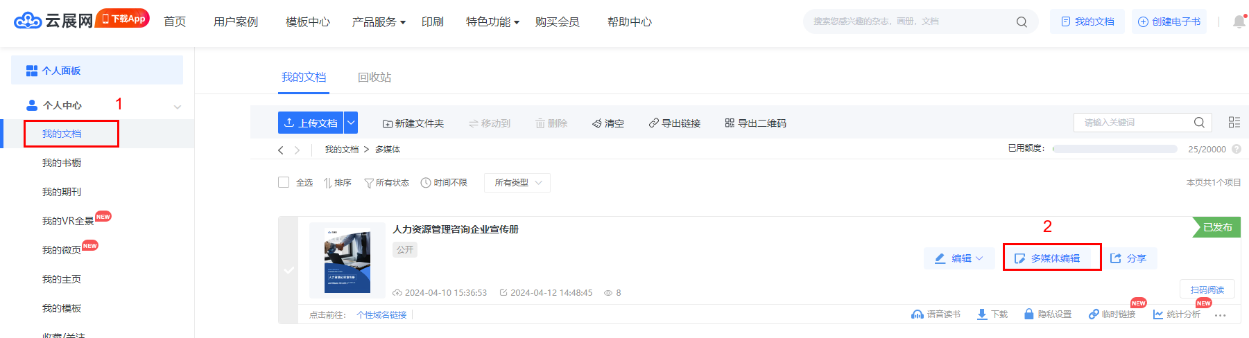 點進【我的文檔】/【文檔】,選擇對應電子書,點擊【多媒體編輯】/【內容編輯】