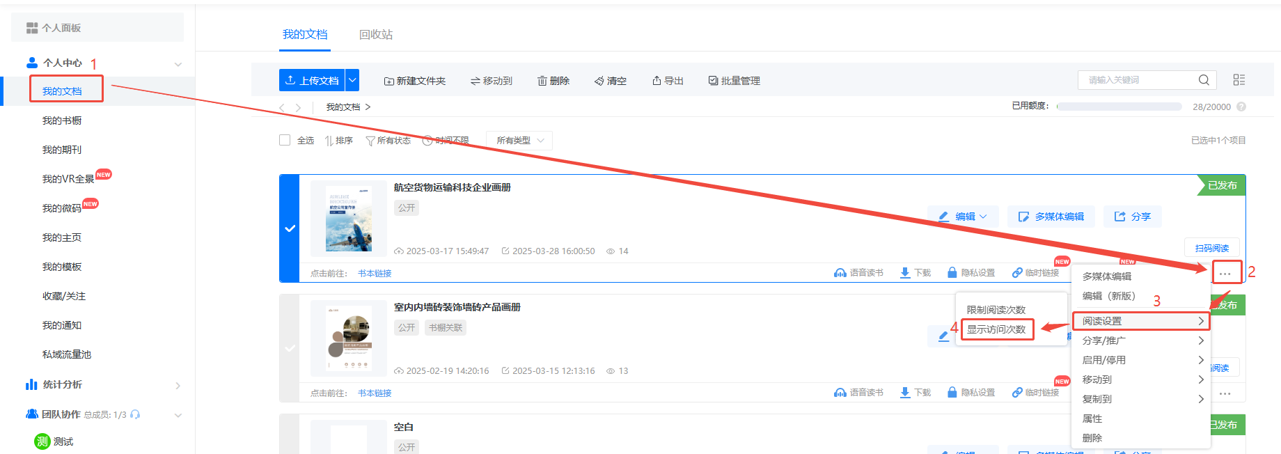 點擊【我的文檔】,找到需要設置的書本,點擊右邊三個點,再點擊【閱讀設置】,最后點擊【顯示訪問次數】。