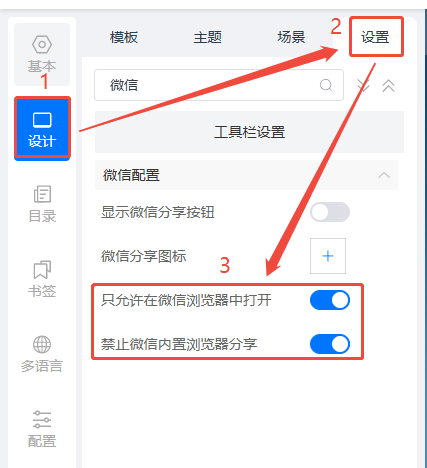 點擊【設計】,然后點擊【設置】,將【只允許在微信瀏覽器中打開】和【禁止微信內置瀏覽器分享】打都打開。