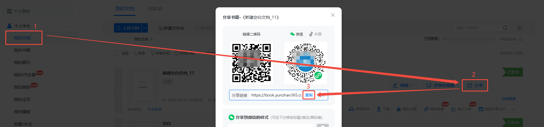 點擊【我的文檔】,然后點擊【分享】,復制書本鏈接