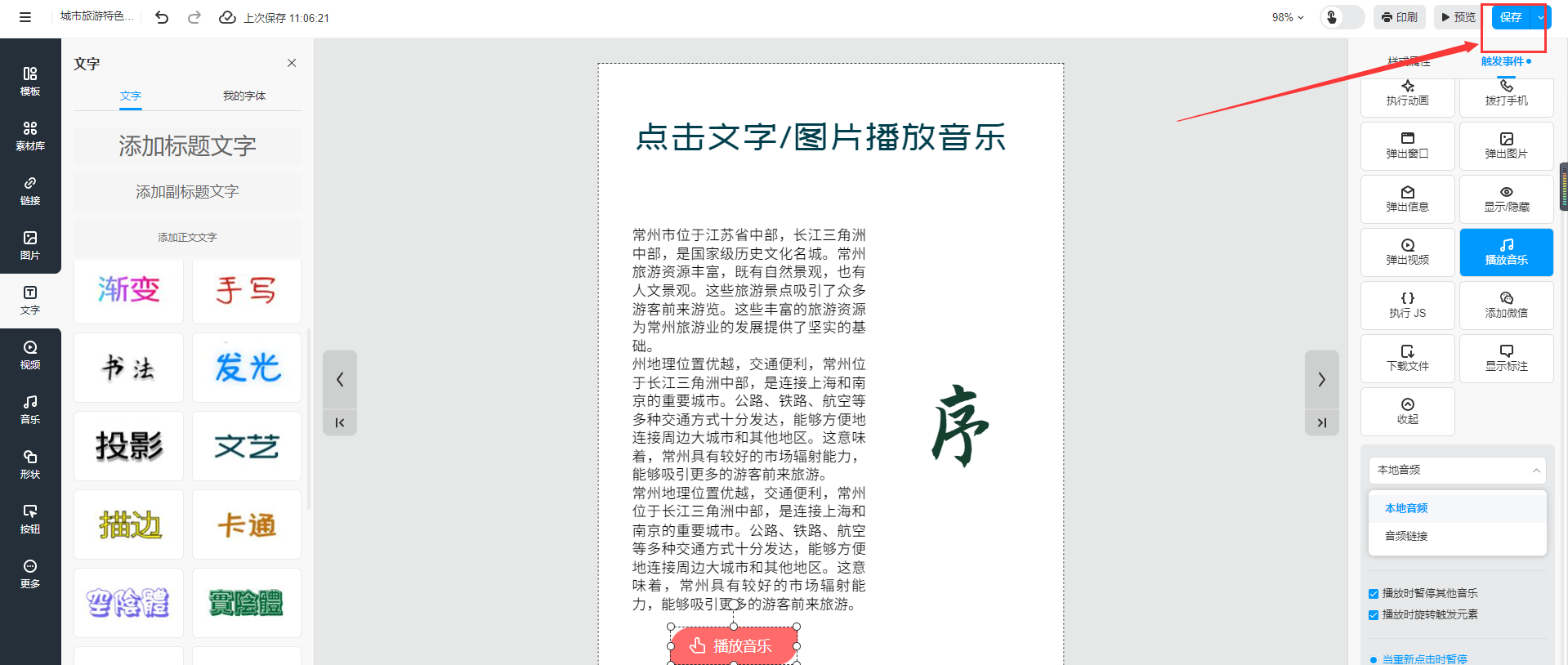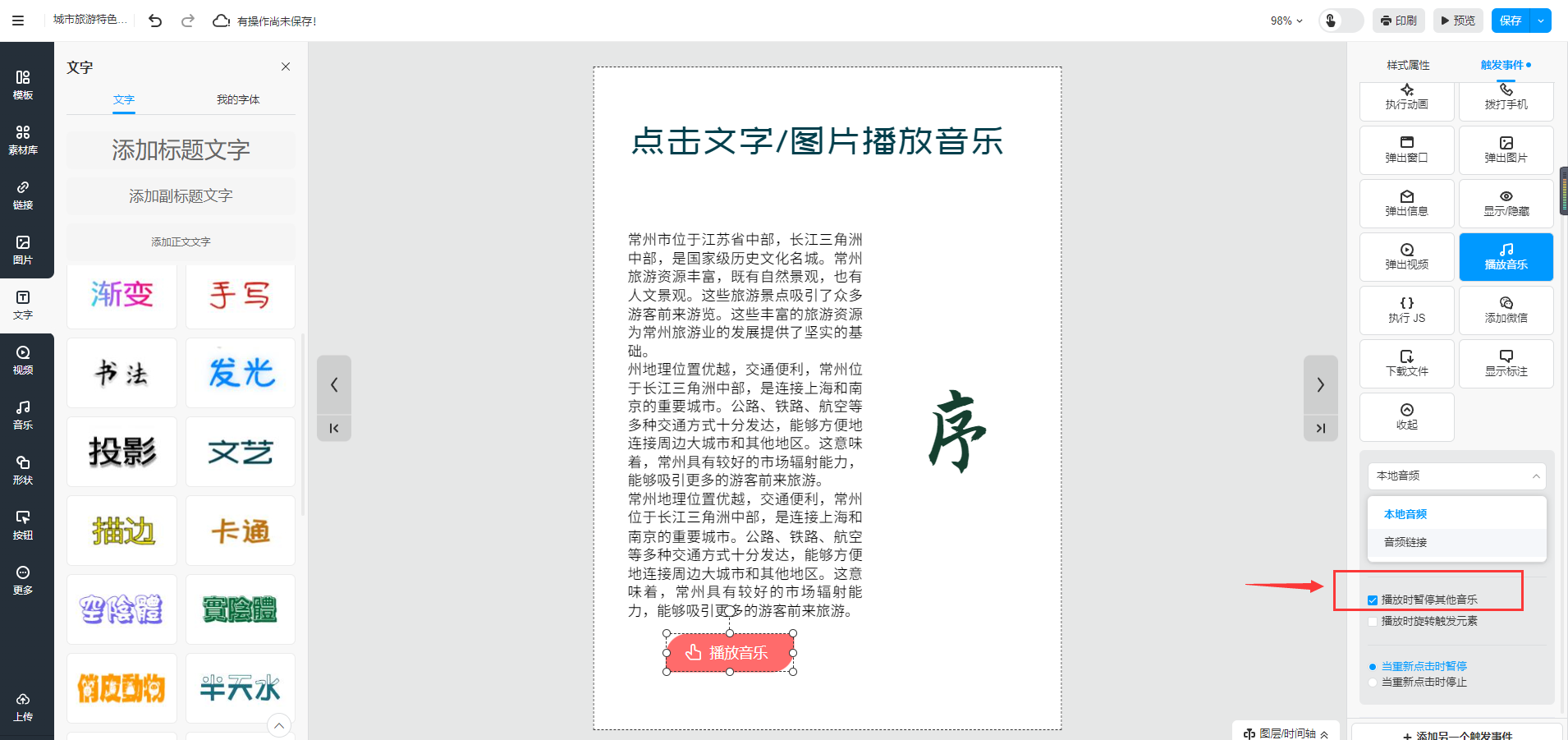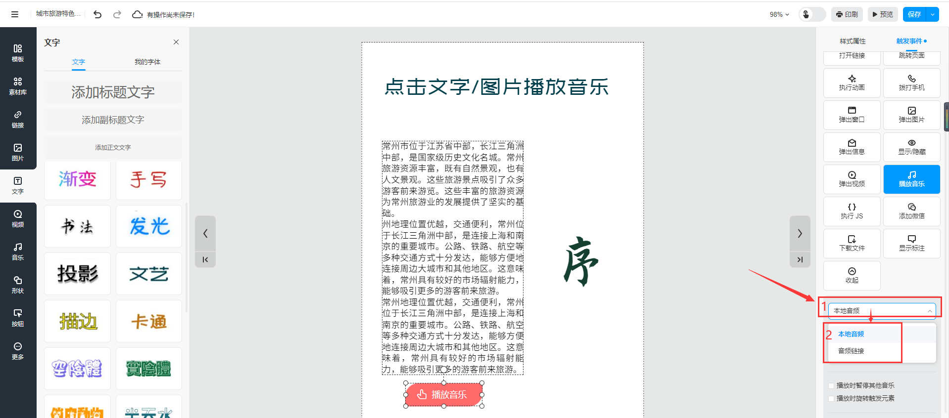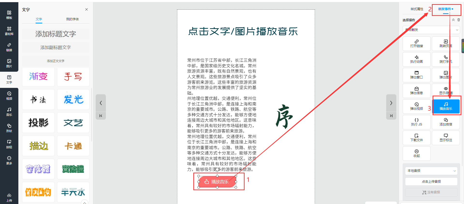選中需要播放音樂的文字或者圖片,然后點擊【觸發事件】選擇【播放音樂】