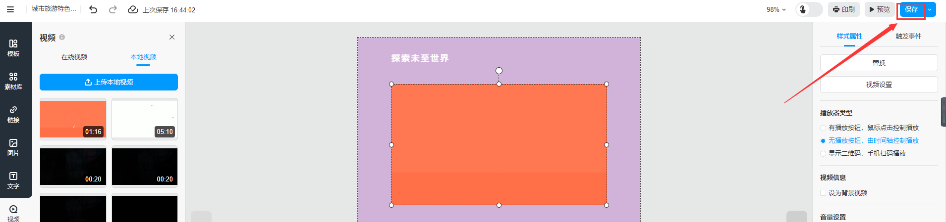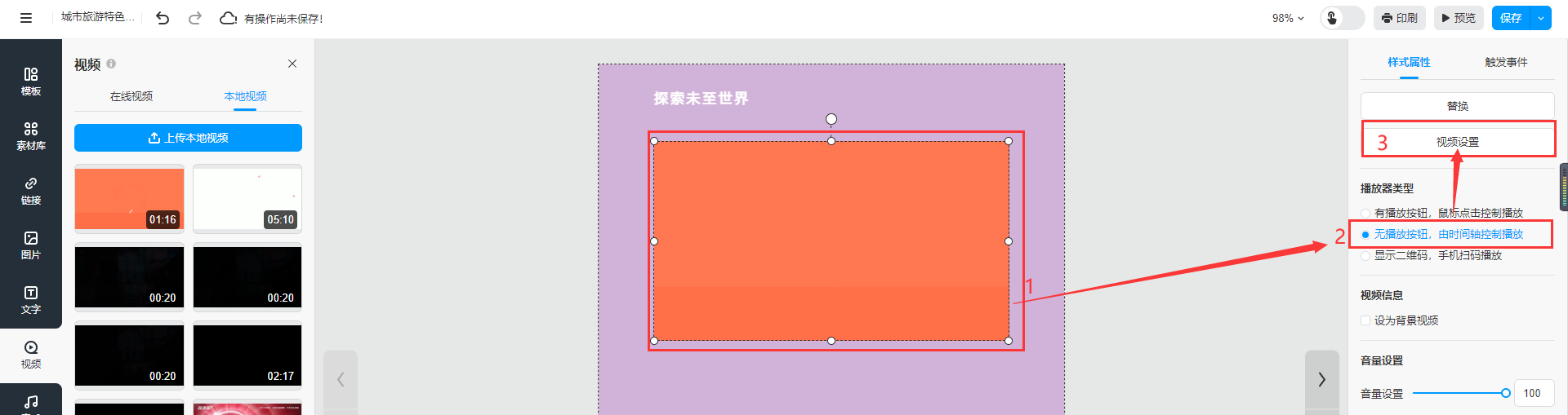 選中本地視頻,選擇【無播放按鈕,由時間軸控制播放】,然后點(diǎn)擊【視頻設(shè)置】
