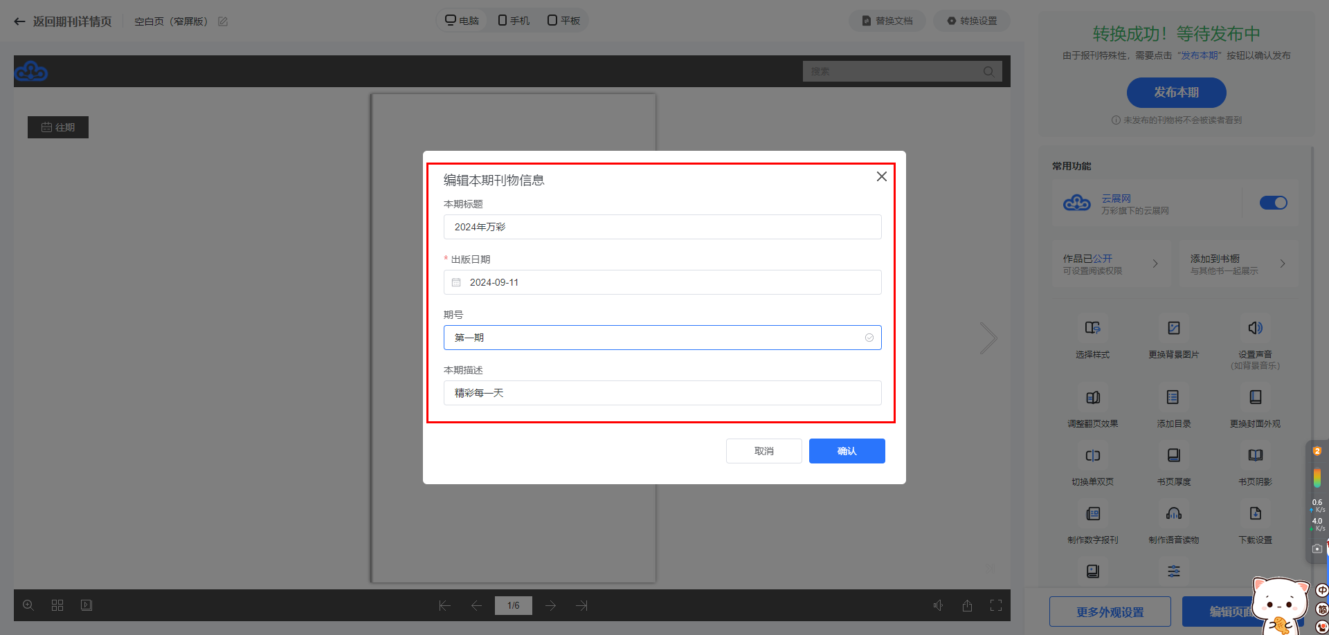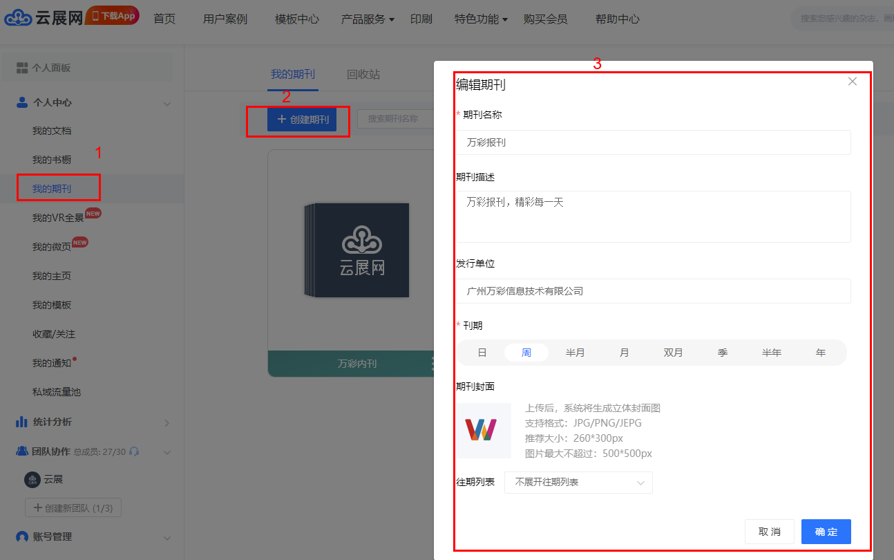 點擊【我的期刊】,【創建期刊】,輸入期刊名稱,描述,單位,刊期(如日刊選日),封面,也可以設置是否展開期刊列表