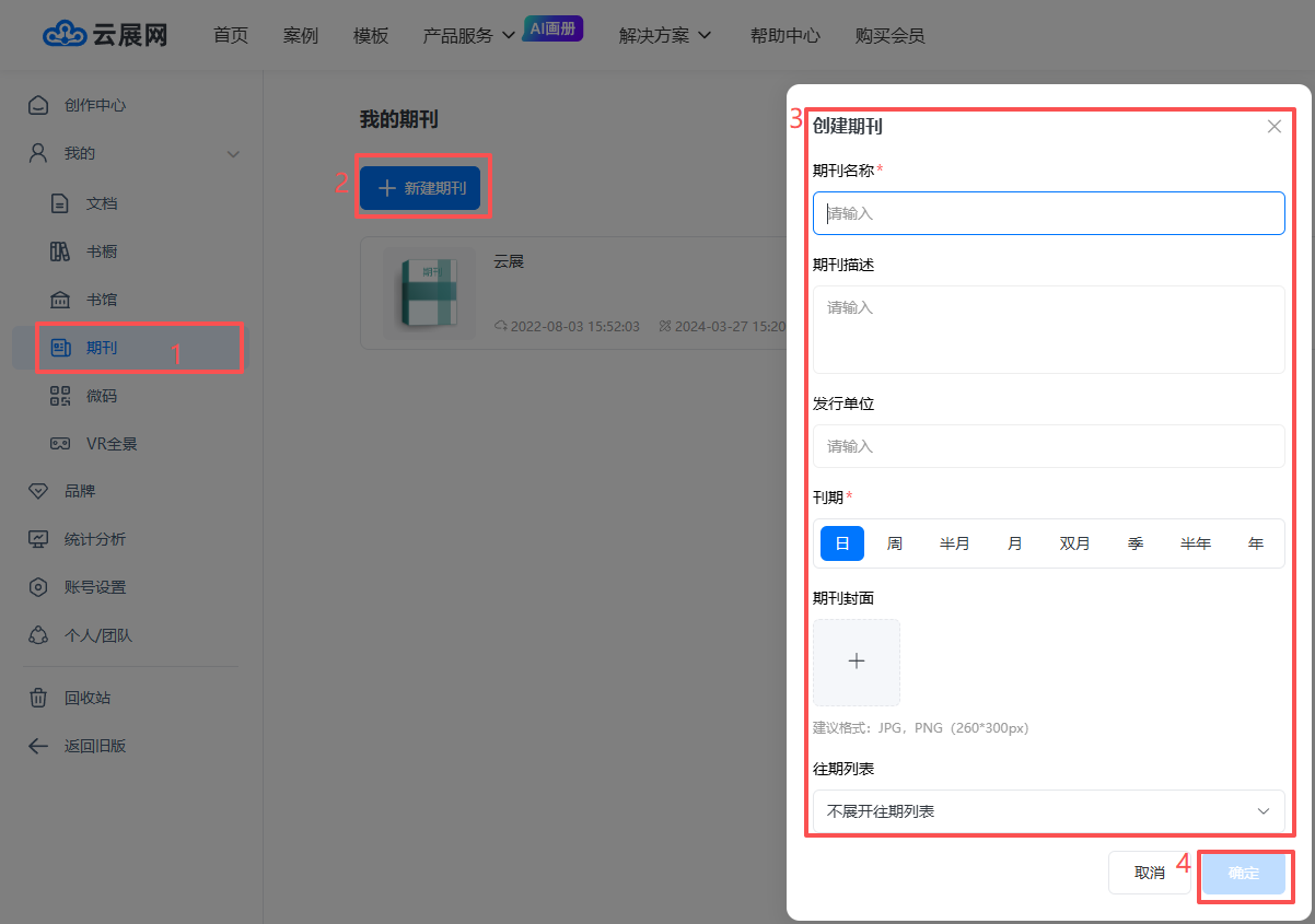 點擊【期刊】,點擊【新建期刊】,輸入期刊名稱,描述,單位,刊期(如日刊選日),封面,也可以設置是否展開期刊往期列表,設置好后點擊【確定】。