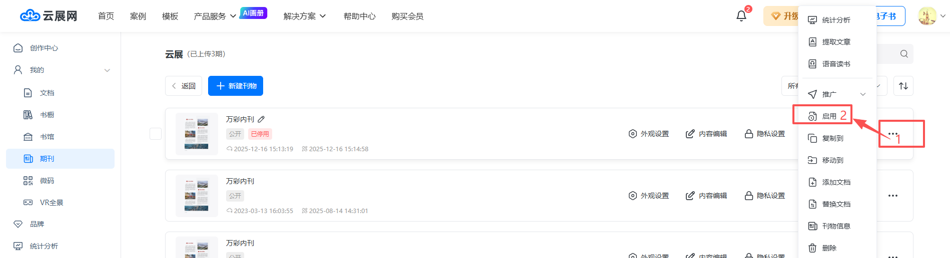 如果想晚點發布,可以先不點發布本期,確定發布了后,到【管理期刊】頁面,點擊右邊的【…】按鈕,點擊【啟用】。