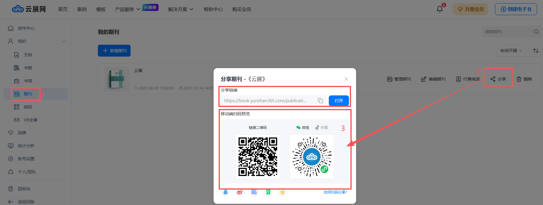 在【期刊】頁面,點擊【分享】,可以打開期刊鏈接預覽或者用手機掃碼期刊二維碼預覽。