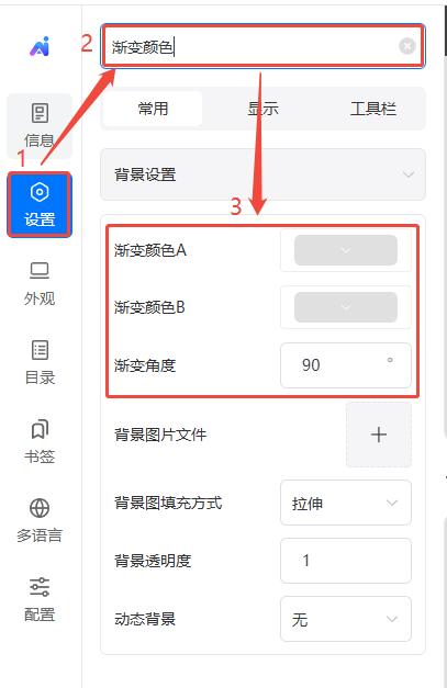點擊【設置】,在上方搜索欄搜索【漸變顏色】,然后在下方【漸變顏色A】和【漸變顏色B】分別選擇一個顏色,最后調整【漸變角度】即可。