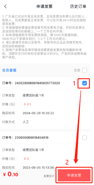 勾選需要申請發(fā)票的訂單,然后點擊【申請發(fā)票】。