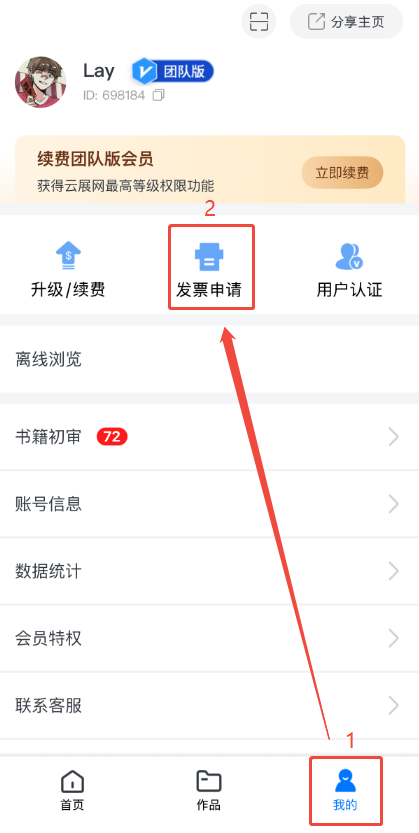 打開云展app,點擊【我的】,點擊【發(fā)票申請】進(jìn)入申請頁面。
