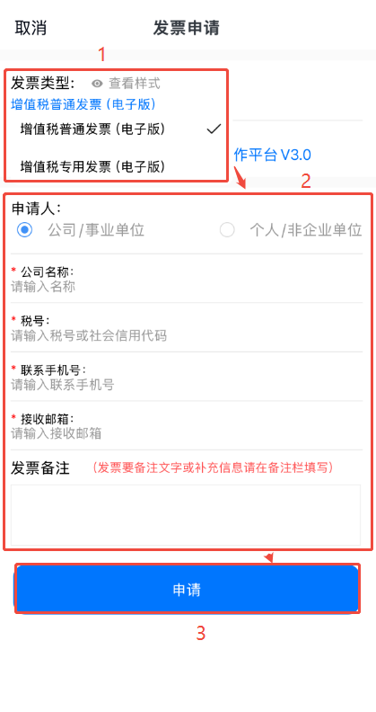 點擊【增值稅普通發(fā)票(電子版)】,選擇發(fā)票類型然后填寫相關(guān)信息,信息要確保無誤,如需在發(fā)票上備注文字,或者普票需要補(bǔ)全地址電話開戶行賬號的,請在發(fā)票備注欄上填寫,避免影響報銷,填寫完點擊下方【申請】即可。