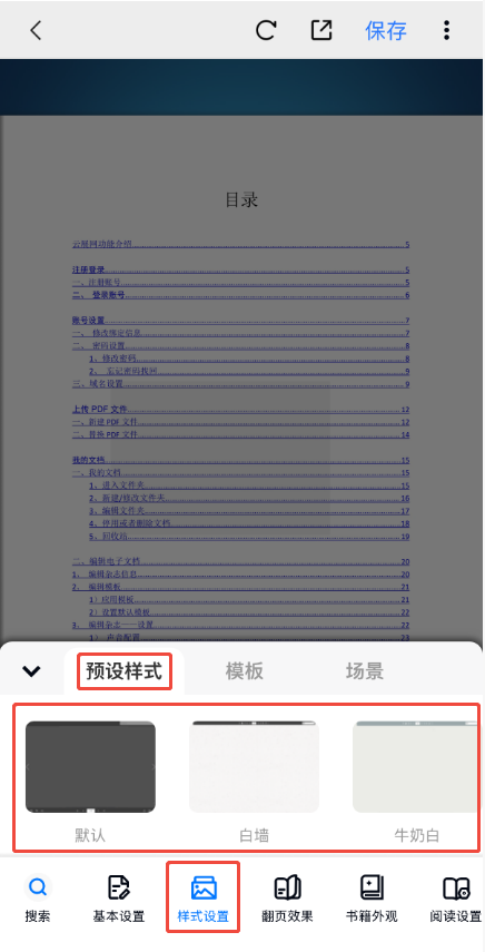 點擊【樣式設置】,然后點擊【預設樣式】,可以看到云展網提供的背景圖,根據自身喜好選擇即可,左滑可以查看更多背景圖。