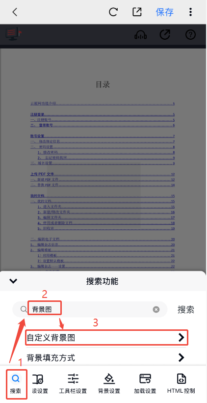 點擊左下角【搜索】,在搜索框輸入【背景圖】,然后點擊【自定義背景圖】即可上傳自己的圖片,上傳后點擊右上角【保存】即可。