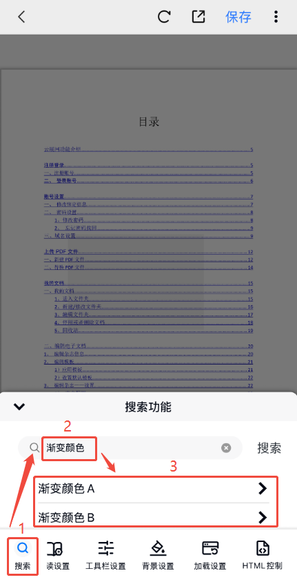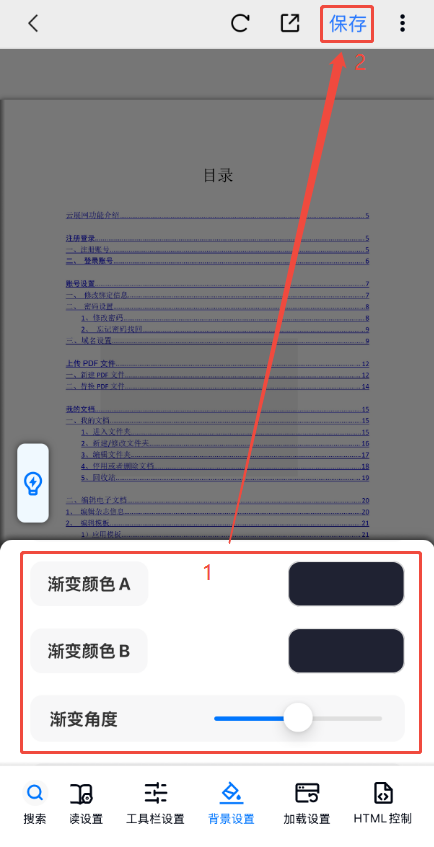 點擊左下角【搜索】,在搜索框輸入【漸變顏色】,然后點擊【漸變顏色A】或者【漸變顏色B】,選擇顏色以及調整漸變角度后,點擊右上角【保存】即可。
