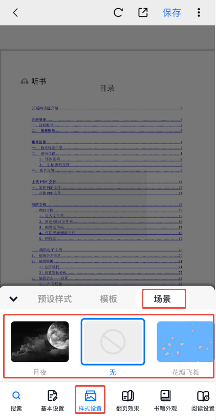 點擊【樣式設置】,然后點擊【場景】,可以看到云展網提供的動態背景,根據自身喜好選擇即可,左滑可以查看更多場景。