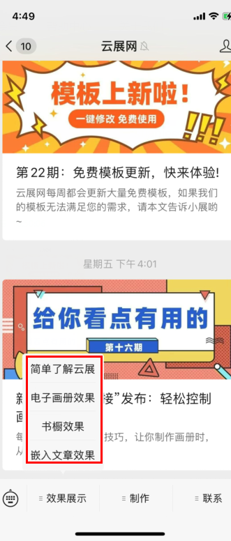 您可以把云展網生成的電子書/書櫥分享到微信公眾號上,提高曝光率讓更多人看到,把電子書/書櫥放到公眾號讓讀者閱讀,有四種展現形式。