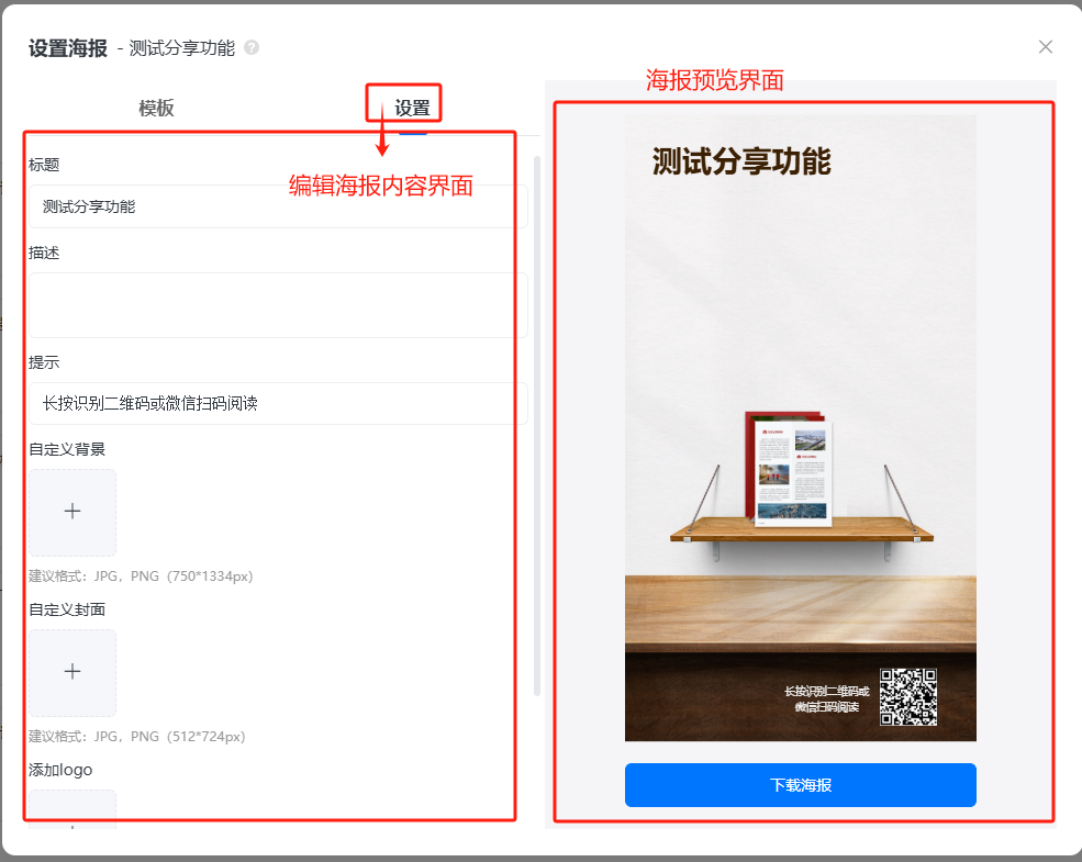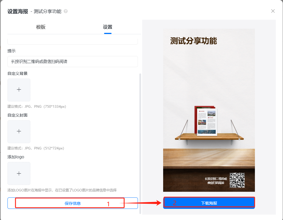 如何生成書櫥海報? 一、功能介紹 電子海報,也是日常中常見的一種宣傳方式,海報不僅能提高品牌形象,還能拓展品牌認知度,有利于推廣市場。讀者掃碼進入書櫥,可以同時看到書櫥里的所有書,還能互相轉發,非常方便。 二、操作步驟 1、生成海報 在【書櫥】頁面,點擊右邊三個點,隨后點擊【推廣】,點擊【生成海報】。 2、選擇模板 點擊【模板】,選擇一款合適的模板。 3、編輯海報內容 點擊【設置】,編輯海報內容。 4、下載海報 編輯好之后點擊【保存信息】,然后點擊【下載海報】,即可下載下來。