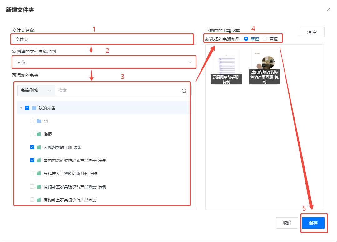輸入文件夾名稱(文件夾名稱就是分類名稱),設置新創建的文件夾需要添加到的位置,然后從文檔或者期刊中選擇書籍,最后設置新選擇的書本需要添加到的位置,點擊保存。